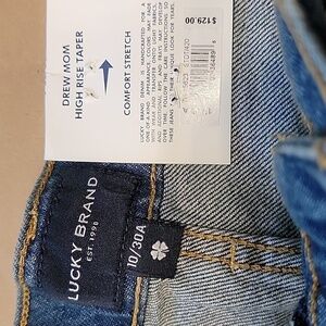 Lucky Brand Size 10/30 Ankle Drew Mom High Rise Taper Blue Jean NEW with Tag, The Drew Mom jean is a retro-inspired high rise with minimal stretch, slim through the hips and tapering to a cropped leg. High-rise slim fit with a tapered cropped leg. Medium wash denim. Comfort stretch with just the right amount of give. 5-pocket styling with button-fly. Factory Fading and Whiskering. Please refer to measurements in photos to ensure proper fit.