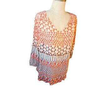 v neckline, 3/4 sleeves, lightweight print boho fabric, 3/4 sleeves and cut out keyhole back- rounded bottom hem line new with tags and msrp $89.50