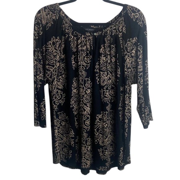 Lucky Brand Size 2X Black Tan Floral Blouse Top Prairie Boho Neutral Scoop Neck