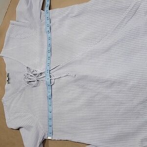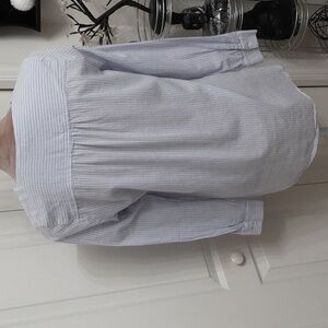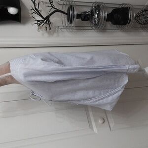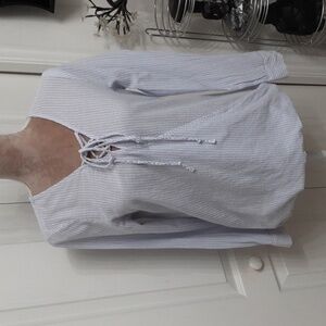 Lucky Brand, Size S, Blue White Striped Lace Front Blouse, Bubble Hem, Hi-Low. Gently Used Condition, No Rips, Holes, Stains or Snags. Cute wrap style blouse with bubble front hem, lower back hem and 1/4 lace front detail. Please refer to measurements in photos to ensure proper fit.