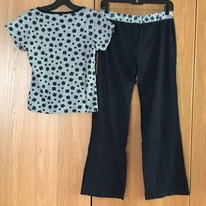 Vintage Lucky Brand shamrock print sleep set. Top is v-neck with cap sleeves. Long pants have a shamrock print elastic waistband with twill tape tie. 100% cotton. So cute for sleep or lounging around!