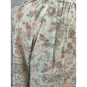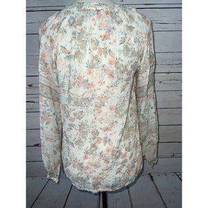 Lucky Brand Womens Blouse Shirt size Small. Floral with tassels that tie on collar. Boho Hippie bohemian. Off white, peach and gray in color. 100% Viscose. Pit to pit 19", back bottom of collar to bottom of shirt 24", pit to end of sleeve 18". Made in Indonesia. Great preowned condition with no rips or stains. Perfect for the career or business casual woman.