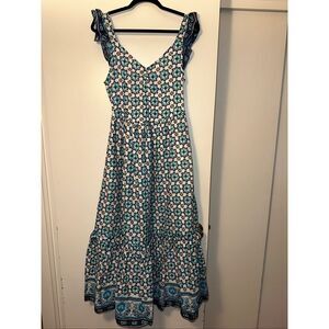 Lucky Brand Small Ruffle Maxi Dress White Green Blue Black Pattern Mandala NWT