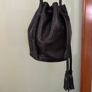 Lucky Brand Small Cowhide Pouch Drawstring Purse. Very soft black pebbled leather. Two small open pockets inside bag. Shoulder cord 52" end to end. Original Price was approximately $100. Like new condition (used once). Bottom diameter 6"; 7" tall. Unlikely to reduce price due to excellent condition.