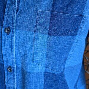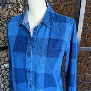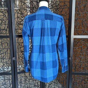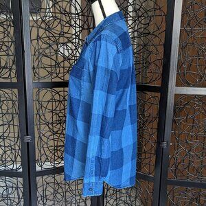This denim button down shirt features tonal navy blue buttons, a classic fold-over collar with contrasting red stitching, and a large buffalo plaid allover print. Item has no damage or wear.
