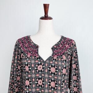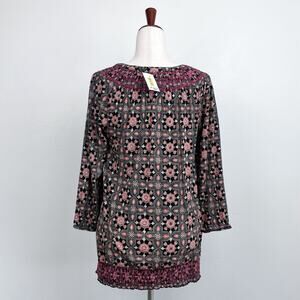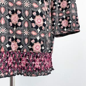 NWT Large Lucky Brand blouse. Black and pink bohemian patterned blouse. Stretchy and soft fabric. Pink smocking around the neckline and bottom hem. Three-quarter length sleeves. Great condition!