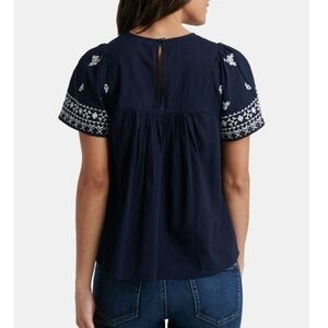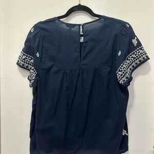 Navy with white embroidery design top. Peasant and lightweight. Machine wash, 100% cotton.