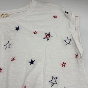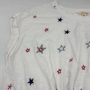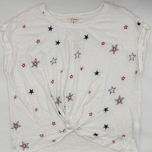 NWT - 100% cotton fabric T-shirt with twist front detail, embroidered star print, crewneck, and dolman cap sleeves. Pit to pit measurement approximately 24.5”, full length from shoulder 24.5”.
