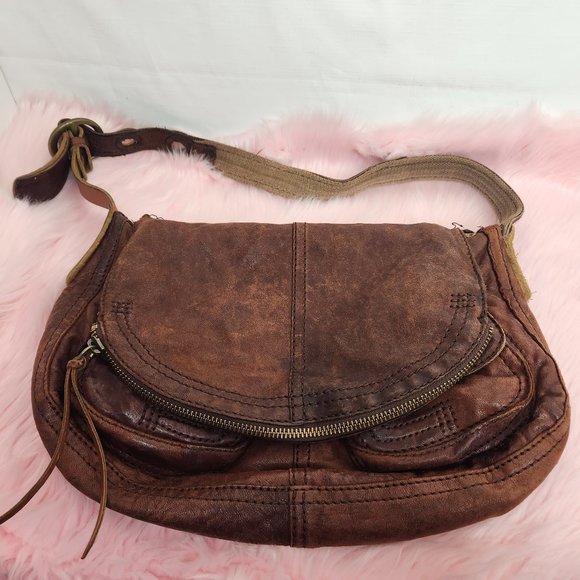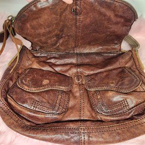 Lucky Brand Stash Brown Lamb Distressed Leather Fold Over Shoulder Hobo Bag