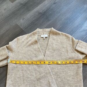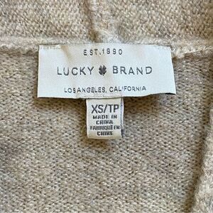 Lucky Brand Surplice faux wrap sweater. Gorgeous neutral oatmeal color that a wardrobe staple as it can be work casual or for work. Size XS with stretch. Ribbed cuff and hems. Material: 71% acrylic, 26% polyester, 3% spandex. Please see photo section for approximate flat measurements.
