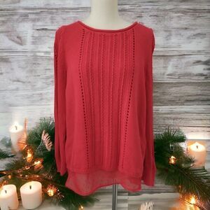 Lucky Brand Sweater S Red Layered Chiffon Long Sleeve Pullover Swiss Dot Flowy. Condition is pre-owned with no rips, tears, holes or discolorations. Great for the holidays and Valentine's Day. Swiss Dot chiffon underneath a knit sweater. Button detail. PLEASE SEE MEASUREMENTS!!