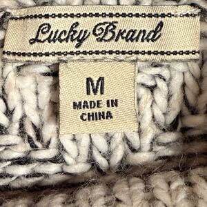 Cozy and stylish Lucky Brand sweater in women’s size Medium. Features a warm turtleneck, soft fair isle knit pattern, and fringe detail along the side for a unique boho look. Knit in neutral gray tones with black accents, perfect for layering in fall and winter. Made from a wool blend for softness and warmth.