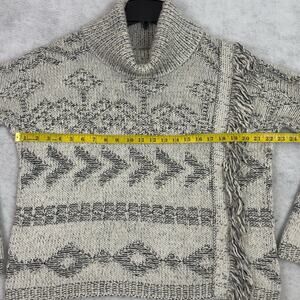 This sweater is size M, gray with black pattern, and designed as a fair isle knit pullover style. It includes a turtleneck, long sleeves, fringe trim, and a boho chic feel. The fabric blend is 55% acrylic, 29% wool, 9% cotton, and 7% nylon. Condition is pre-owned, excellent with no flaws.