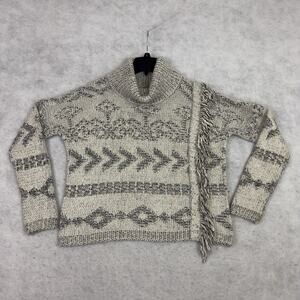 Lucky Brand Sweater Womens M Gray Fair Isle Turtleneck Fringe Knit Pullover