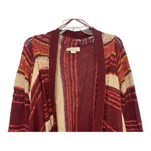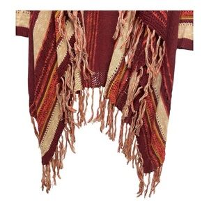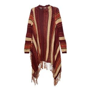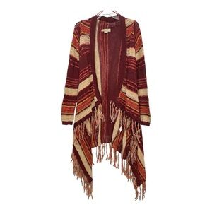 This Lucky Brand women's cardigan is a beautiful addition to any bohemian wardrobe. Made of a cotton and linen knit fabric with a maroon and orange striped pattern, this sweater features long sleeves and oversized styling for a comfortable and relaxed fit. The fringe accents give it a unique touch, making it perfect for any boho-themed outfit or occasion. In great condition
