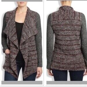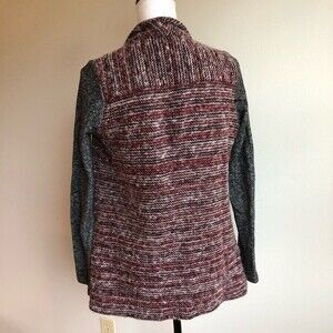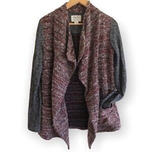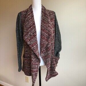 Thick chunky marled red open cardigan sweater by Luck Lotus Lucky Brand. Burgundy merlot wine marled stripe printed color with grey color block long sleeves. Draped open waterfall front. Fuzzy boucle knit texture. Comfy and cozy. Convenient pockets. 5% wool. Good used condition. No flaws.