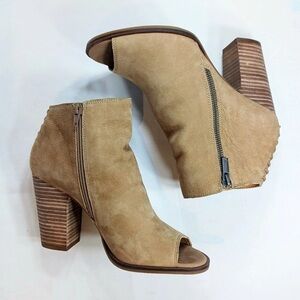 Crafted from soft suede, these Lucky Brand ankle booties feature a chic peep-toe design and a sleek silhouette. The neutral tan color and medium stacked heel make them versatile for any occasion, while the back zipper ensures easy wear.