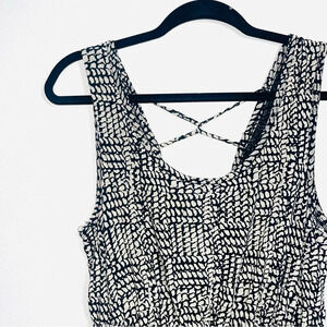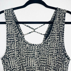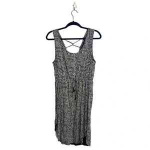 Lucky Brand tan & black printed knee-length sundress. In excellent condition! Scoop neckline. Sleeveless. Drawstring waistline with tassels. Rounded bottom hem. Strappy back. V back. Knee-length. Unlined. Black with tan print. Size small.