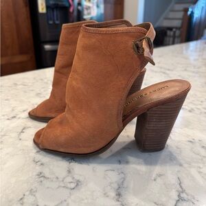 Elegant cognac leather peep-toe heels. Perfect for versatile styling.