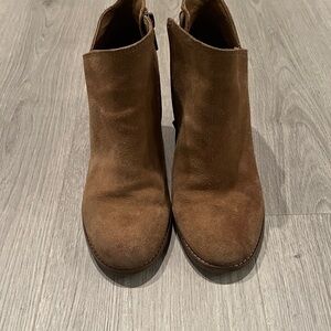 Chic tan suede ankle boots with a stylish design. Wedge heels. Pre-owned in good condition. Some wear of the leather at the toes. Please see pictures.