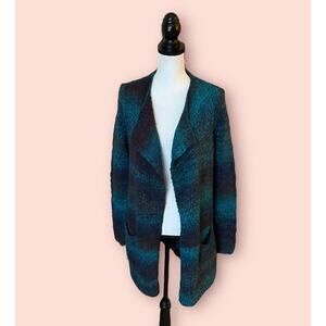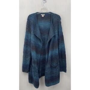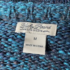Lucky Brand Women’s Blue Te cardigan Wool Blend Open Front Tunic Sweater. Patch front hip pockets. Gently worn, no issues. Fabric tag has been cut out but made of 70% acrylic 30% Wool. Chunky Knit