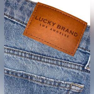 These Lucky Brand cutoff shorts feature a medium blue wash with intentional stylized distressing throughout the shorts, Zip fly with button closure, 5 pocket style, no intended rips, snags, or imperfections, no stains or pilling noted.