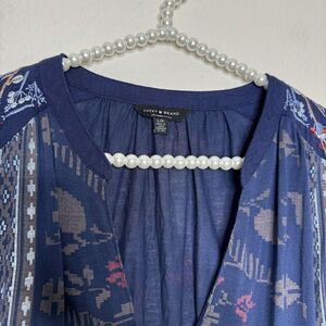 Lucky Brand Top Large Blue Square Stitch Print Embroidered V-Neck Boho Peasant