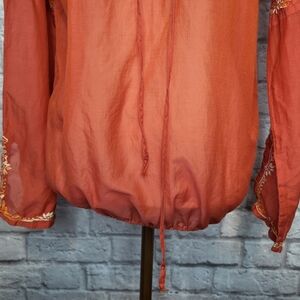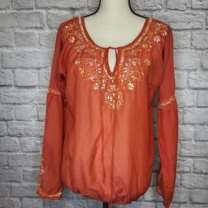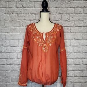 Lucky Brand Top Orange Cream Embroidered Split V Neck Ties Long Sleeve Size S