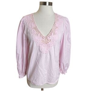 Lucky Brand Top Size Medium White‎ Floral Short Sleeve V Neck Peasant Ruffle Hem