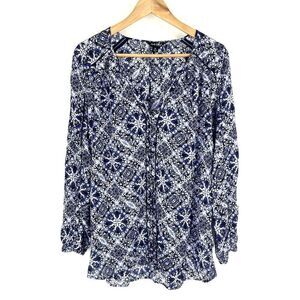 Lucky Brand Top Size Medium Women Blue Blouse Geo Print Eyelet Peasant V Neck