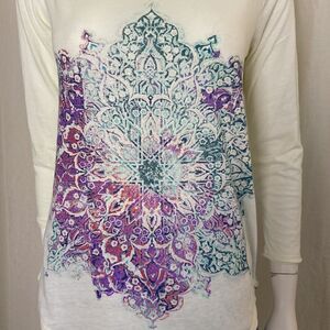 Lucky Brand off white tee shirt with purple and blue zen design on the front