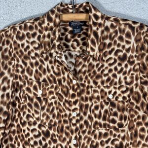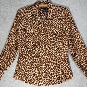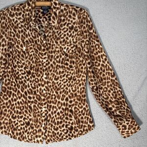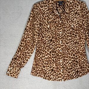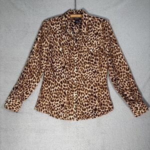 Lucky Brand Top Women’s Size S Leopard Print 100% Silk Button Up Chic Animal AOP