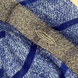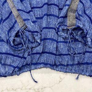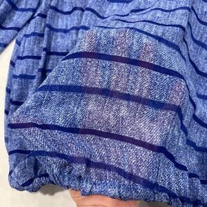 Great royal blue silver sheer blouse. Has thin elastic at hem, ties at cuffs and neck with decorative buttons.