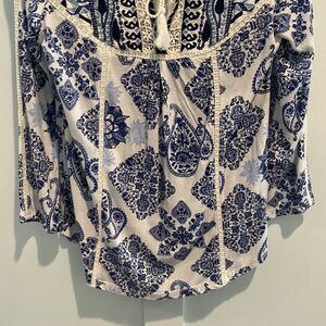 The blouse is suitable for women of all ages and can be worn for different occasions. The peasant-style blouse is perfect for a bohemian or hippie look. It can be paired with jeans or skirts to create a stylish and comfortable outfit. This Lucky Brand tunic blouse is a must-have for any fashion-conscious woman.