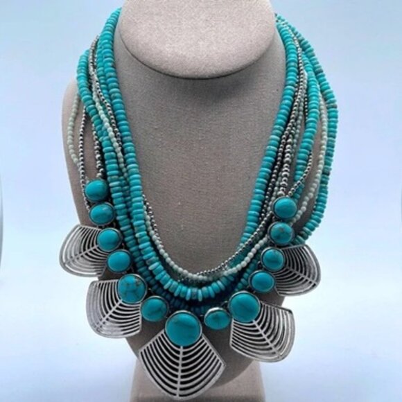 Add a pop of color with a southwest vibe to your favorite outfits with this gorgeous multi-strand beaded turquoise necklace from Lucky Brand. It has multiple rows of silver, aqua and turquoise beads accented with a large statement piece with inlaid turquoise set in silver open work fan shapes. The back clasp has a 1.5” chain to adjust the length with a signature Lucky Brand clover charm. It is in excellent pre-owned condition with no flaws.