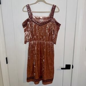 Luxurious and soft, this Lucky Brand velvet dress in size Medium is a must-have for your cooler season wardrobe. Featuring a beautiful dusty rose-pink hue with cold shoulder sleeves and wide velvet straps, it offers a romantic and vintage-inspired silhouette. The dress includes convenient side pockets and a cinched waist for a flattering fit. Made from 94% polyester and 6% spandex with a smooth lining, this dress provides comfort and stretch while maintaining its elegant texture. Made in China, it’s in Excellent Used Condition (EUC) with no noticeable damage. Perfect for date nights, holiday gatherings, or special occasions!