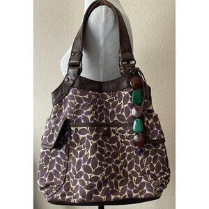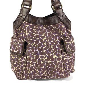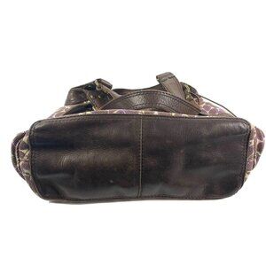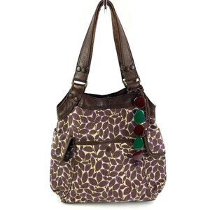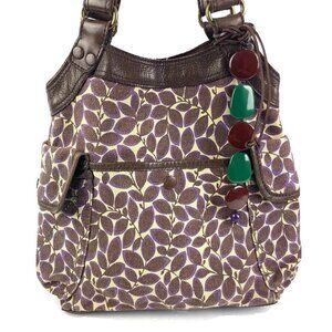 Lucky Brand Floral Handbag Brown Canvas Leather Stone Charm Shoulder Bag Purse.