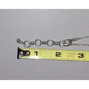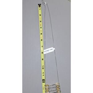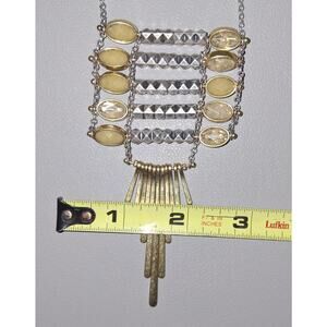 Vintage Lucky Brand ladder burst fringe necklace—new old stock with tags! Featuring a striking grid of pyramid studs and creamy cabochons, this piece blends silver, gold, and gunmetal tones in a tiered, architectural design. The cascading fringe bars create dynamic movement and a flattering silhouette on the neckline.