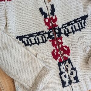 100 percent wool knit sweater featuring a totem pole design with fish or whales at the top. Red, cream and navy colors. Great condition, very minor overall wear from normal use. No holes, rips or stains. Wool is soft and not itchy.