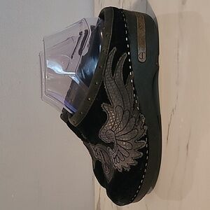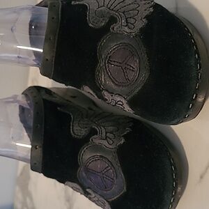 Leather, suede, Peace sign, wings, metal Lucky Brand plate wraps around heels, mules, clogs, retro, vintage, Y2K