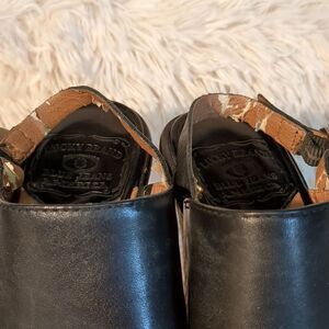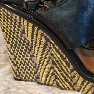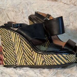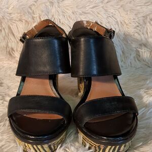 Lucky Brand Patterned Wedge with black and ivory. Two strap with buckle slingback. Inner vegan leather is peeling. Offers always warmly received.