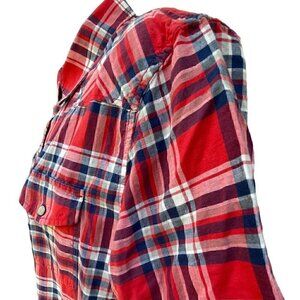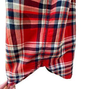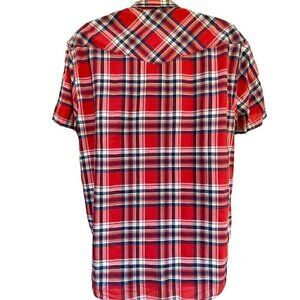 Lucky Brand Classic Fit, Western, retro, plaid red, white and blue short sleeve snap button up shirt. Two front chest button pockets. Lightweight. Back yoke.