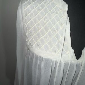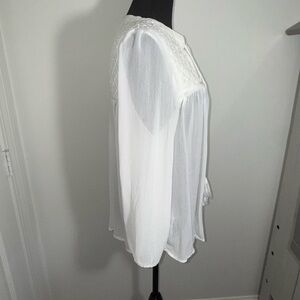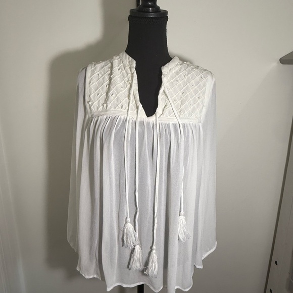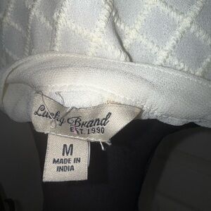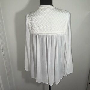 This white blouse from Lucky Brand features a relaxed fit with a stylish tie front and a distinctive bib collar. The long, loose sleeves and airy fabric create a comfortable and chic look, perfect for a casual day out or a relaxed evening. Its bright white color and bohemian-inspired design make it a versatile addition to any wardrobe.