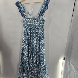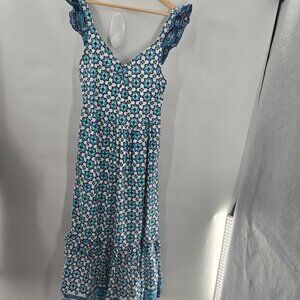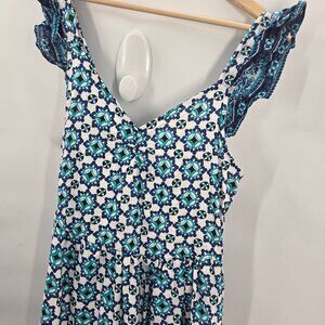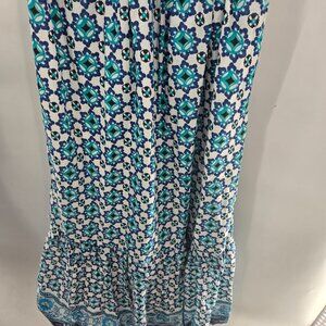 Lucky Brand White Blue Boho Geometric Ruffled Sleeved Maxi Dress Size Medium