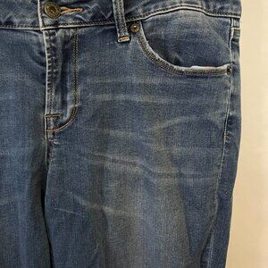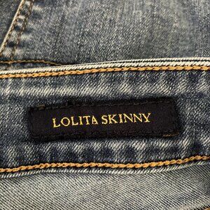 This listing is for pre-owned, in good condition, Lucky Brand Women Lolita Skinny Jeans Size 12/31 Stretch Denim Mid Rise Medium Wash. They have a small scratch/wash line in the upper thigh area near the whiskering lines (see 2nd photo).