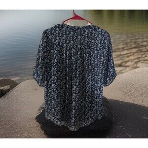 The Lucky Brand Women's Floral Cottagecore Blouse is a stylish and versatile addition to any wardrobe. Featuring a flattering V-neckline and 3/4 sleeves, this pullover blouse is perfect for casual or workwear occasions. The blouse is adorned with intricate lace and embroidered details, giving it a charming and feminine look. Made from viscose fabric with a pleated design, this blouse is comfortable and chic. The blue floral pattern adds a touch of spring, summer, winter, and fall to the wearer's style. Perfect for the modern woman who appreciates classic fashion with a trendy twist.