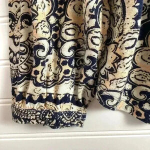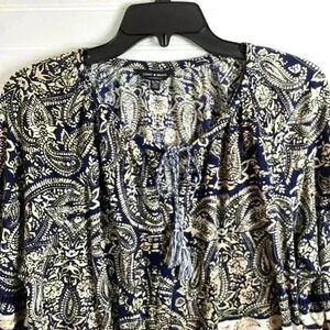 Lucky Brand Women Top XL Blue Paisley Floral Blouse Linen Blend Boho Tassel