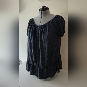 Lucky Brand short sleeve top in a navy blue heathered knit. Features a button-front design, gathered neckline, and peplum-style hem for a relaxed, casual look. Lightweight and soft with a comfortable drape.