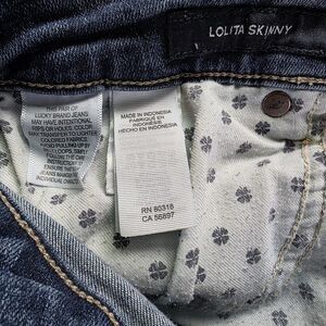 These Lucky Brand Women's 4/27 Ankle Cheville Blue Denim Lotta Skinny Jeans feature a stylish button closure, a 5-pocket design, and a solid blue color. Made from cotton denim with a medium wash, these jeans are easy to care for and offer a comfortable stretch fit. The ankle length and skinny style make them perfect for any season, while the Lucky Brand logo adds a touch of preppy flair. Ideal for everyday wear, these jeans are a versatile addition to any woman's wardrobe.