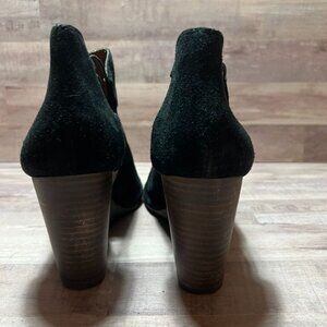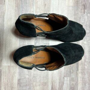 These stylish peep toe wedge booties from Lucky Brand feature a sleek black suede construction. With their sophisticated design, they complement various outfits. The wedge heel offers added height and comfort, making them suitable for both office and casual settings.